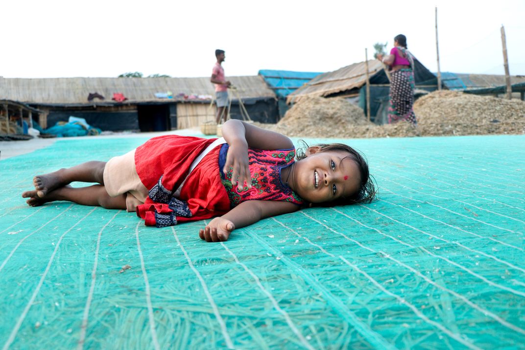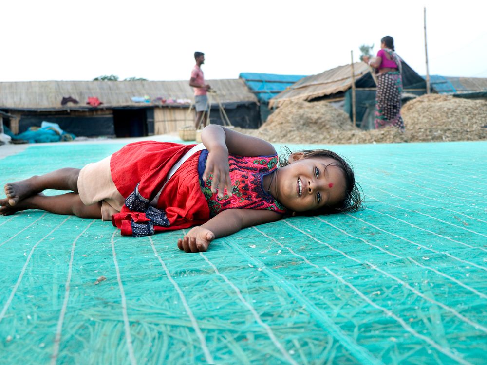 This Photograph was taken at a seaside village located in West Bengal India. This village mainly comprises of fishermen community. Durga, name of the little girl in the Photograph is one of the many children of the village, her parents and grandparents both work as fishermen and they deal in dried fishes as an occupation. Durga is very playfull and this is one of the candid moments.