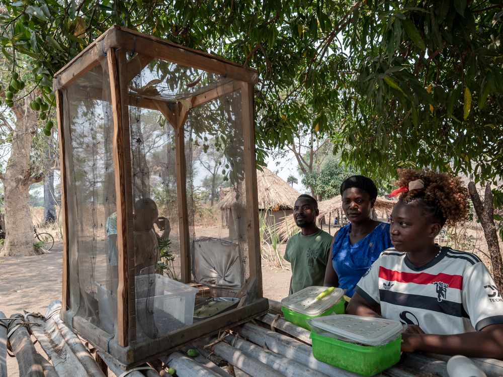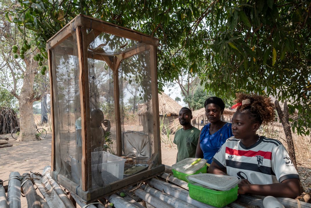 Local Bisa people from the Chitungulu community beside their black soldier flies - an insect farming and a fly project which transform organic waste into high-protein feed for animals and nutrient-rich fertilizer for crops.