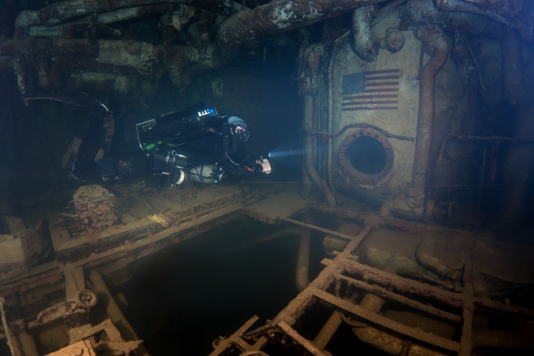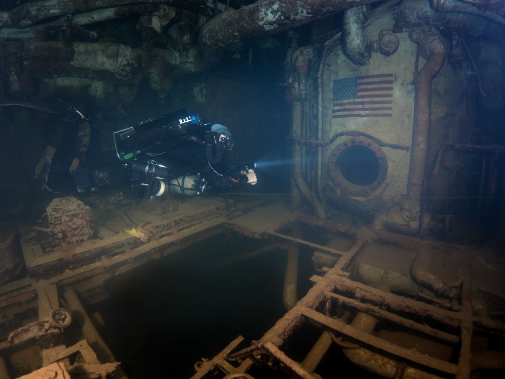 A technical diver explores the engine room of a US Navy ship. The Spiegel Grove was sunk on purpose off Key Largo, Florida, to encourage tourism through scuba divers, marine life growth for fishermen and the health of the ocean. Accessing the engine room requires special training, the use of lines to guide your way in and out, and means spending a lot of time diving in complete darkness. It's and incredible feeling to be inside a massive military ship under the ocean.