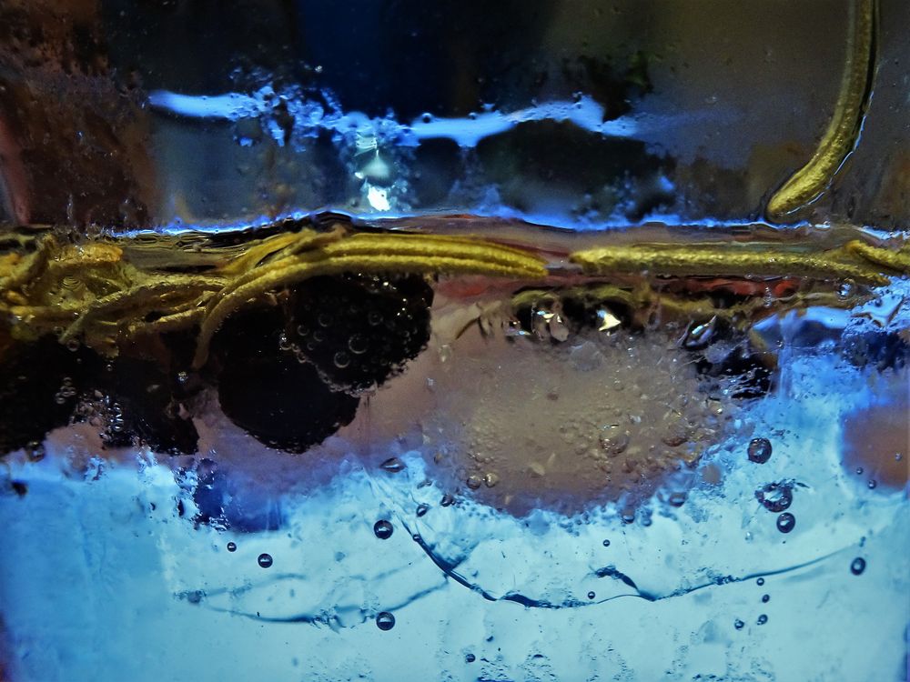 patterns visible through a glass filled up with ice cubes, herbs, blueberries, gin and tonic placed on a orange table lit by some artificial light (light bulb).
