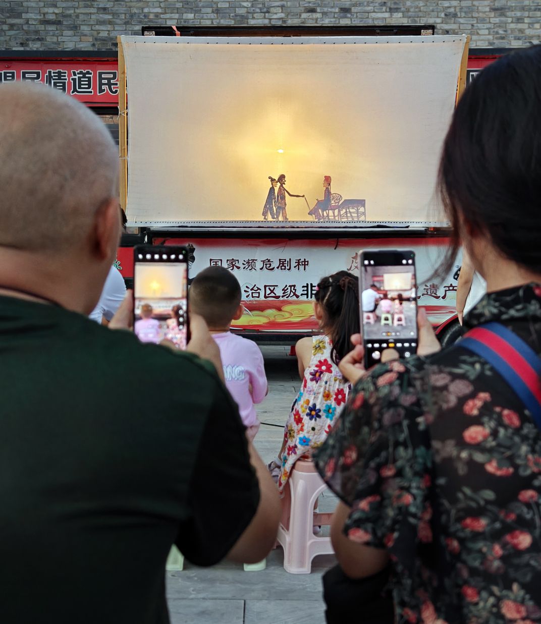 On August 2, 2025, a traditional intangible cultural heritage shadow puppetry performance was held at the Great Wall Park in Yanchi County, Wuzhong City, Ningxia, China, under the cover of darkness. Audience members were enjoying the show and taking photos.