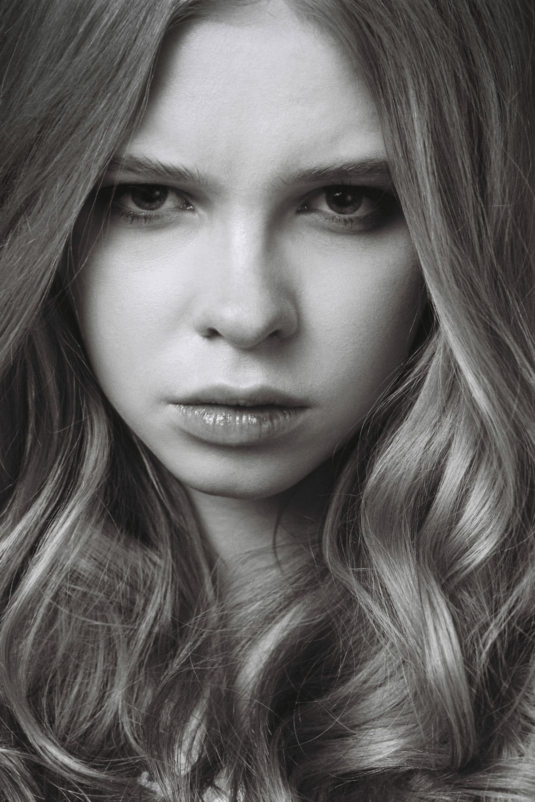 The photo shows a girl's face with a serious and focused look. This picture makes you think about the inner world of a person and what can be hidden behind the external calm.
