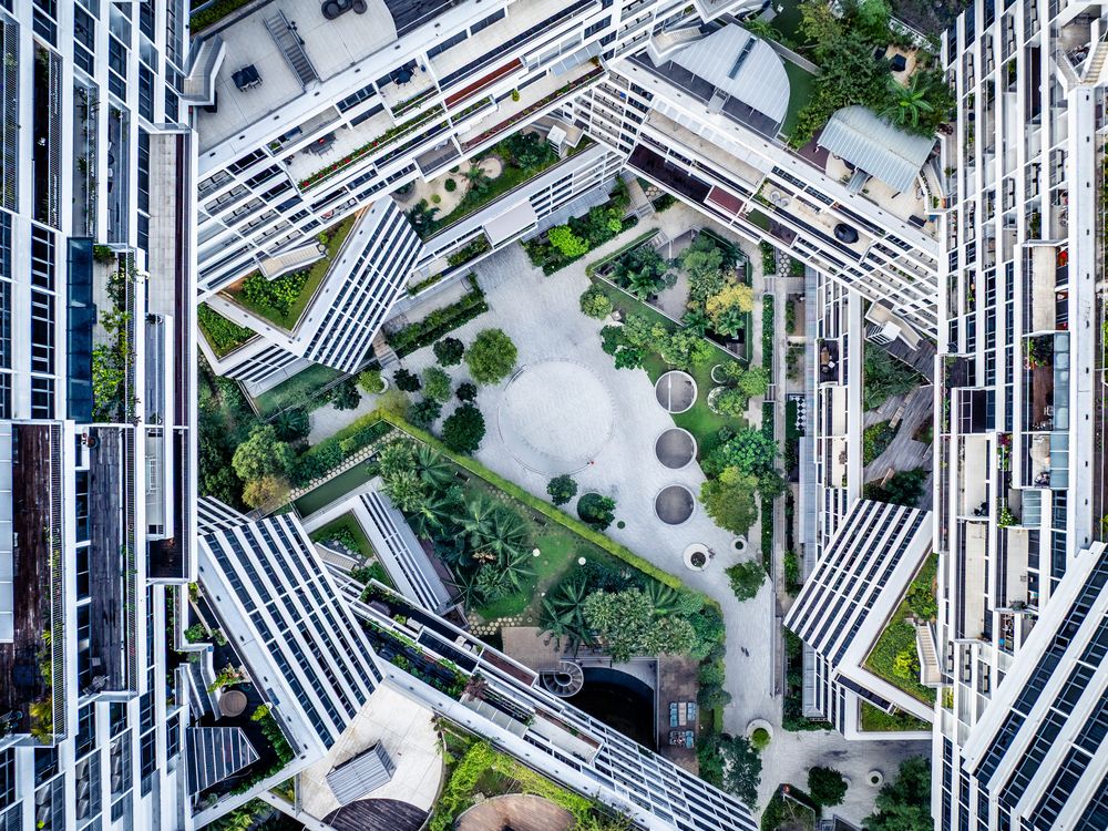 The Interlace condominium in Singapore appears as a striking, geometric network of stacked blocks, forming a bold architectural landmark unlike any other residential complex in the city. From a drone’s top-down view, its interlocking hexagonal layout resembles a giant tessellated puzzle, with lush courtyards and pools woven seamlessly into its dramatic design.