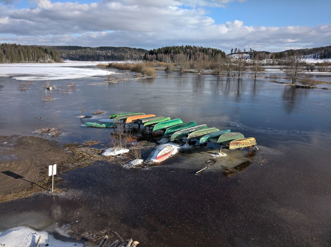 This is a view of a good birding lake, Vanjärvi. It is, unfortunately, also a good fishing and hunting location. The boats are still on winter rolls since the lake ice has only melted partially.