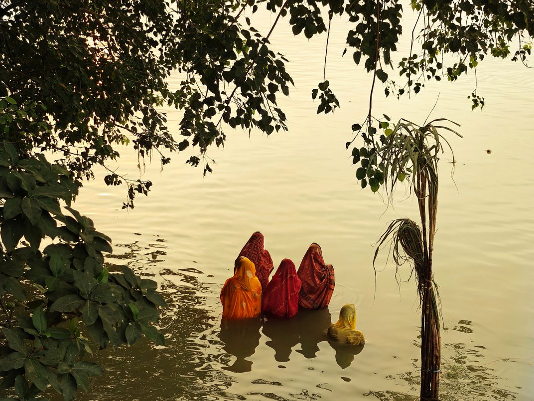 Devotees stand in the Ganges in Kolkata during Chhath Puja, their colourful saris glowing against the calm water. Surrounded by trees and soft evening light, they offer their prayers with silence and devotion. A peaceful moment of faith and nature.