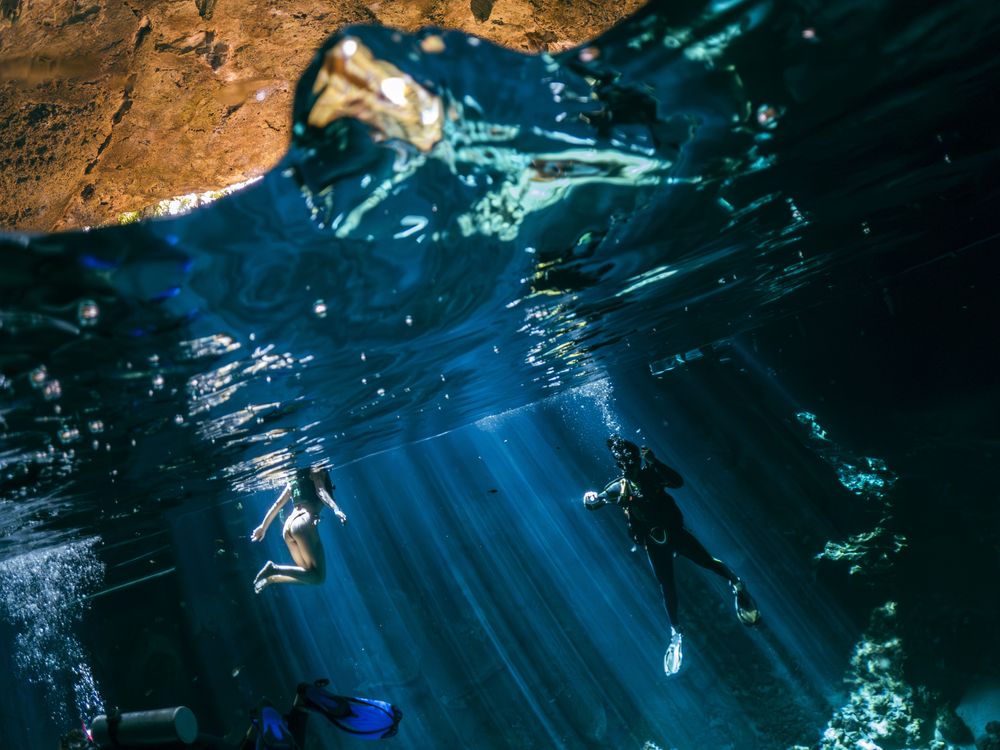 Divers descend into a freshwater cenote where sunlight breaks through small openings in the cave ceiling, creating dramatic shafts of blue light. The water is so clear that the cave roof, divers, and beams of light merge into a single surreal scene. This natural sinkhole system, formed by collapsed limestone, reveals an underground world that has been part of Mayan mythology for centuries.