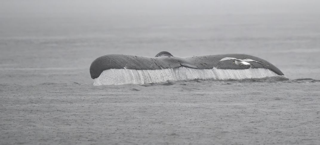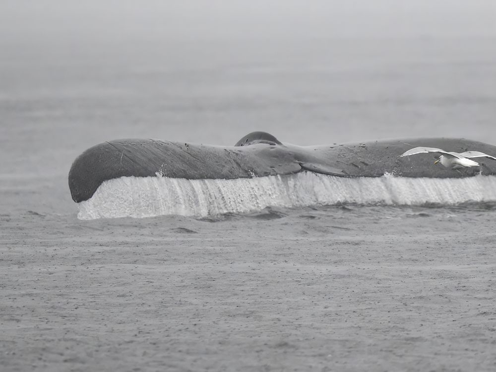 A whale’s fluke rises above the surface in soft grey light, perfectly framing a Glaucous Gull as it lifts from the sea. The bird’s wings align inside the arc of the tail, creating a fleeting moment where two species intersect in the rain.