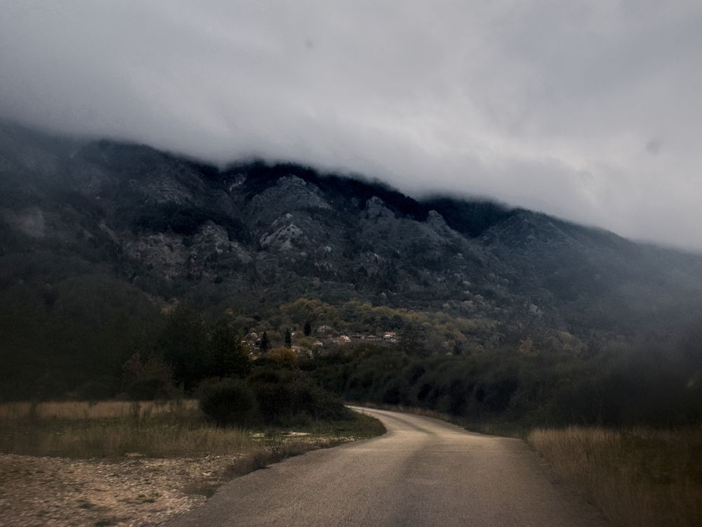 A winding road leads toward the village beneath Mount Tomaros, just as a low cloud descends and hides the upper slopes. The landscape feels suspended — a place where distance, mist and memory blend into a single muted gesture.