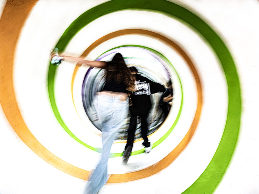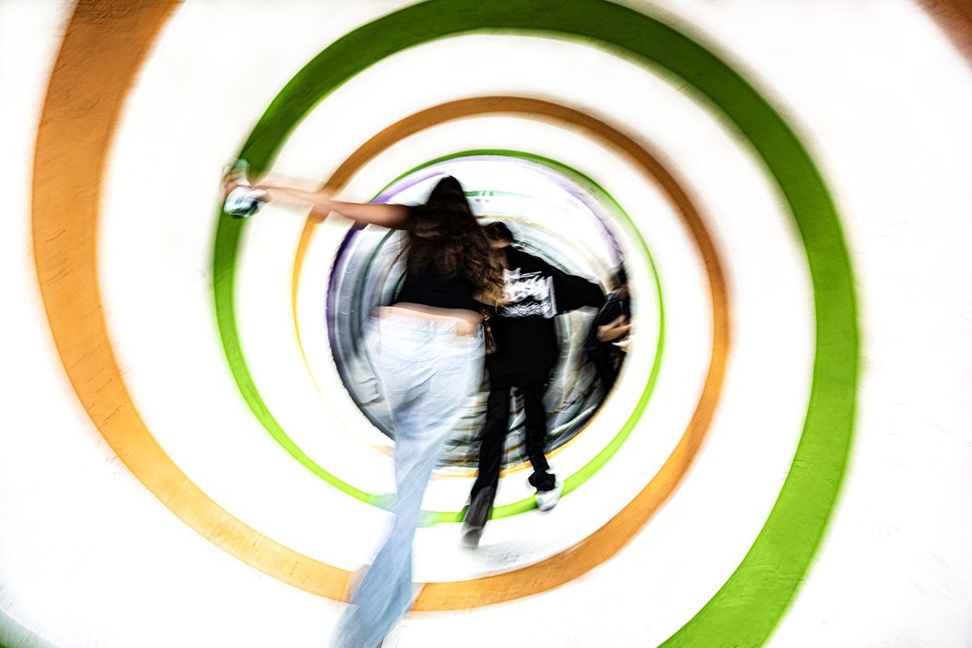 Traveling carnivals in the United States are part of the fabric of the romance of America. Just before school begins throngs of teenagers join in the melee of colorful lights, cotton candy and popcorn to enjoy the last fling of summer. In Agoura Hills, California these youth test their skills of balance as they enter the spiraling tube into a funhouse hopefully without falling. To me it was a metaphor of their transition into adulthood. What adventure and dangers await them as they rush into it.