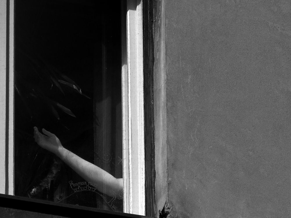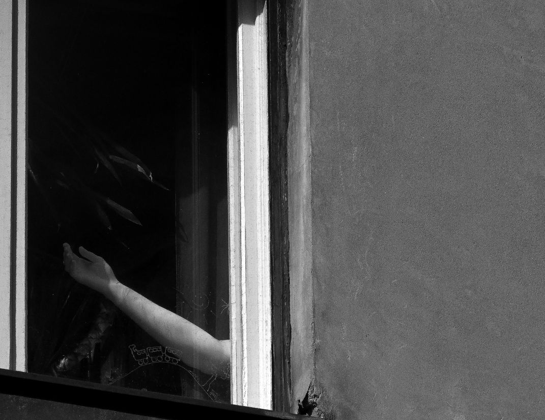 On the day the photograph was taken,I purposely took my camera with me,intending to scout interesting shots,knowing the street I'd be passing through has some interesting details.Quite by chance and with utter wonder,i noticed a mannequin arm/hand waving from a window of an apartment building.Plants could also bee seen in the interior so the place must have been occupied by tenants with a pulse as well,not just this immortal anthropomorphic entity.I was reminded of the use of mannequins in Italian giallo films and also general art direction in Polanski's Repulsion,which is why I chose to produce the photo in black and white.I find the image to be alluring and inviting,and not just for literal reasons.My cynical imagination sees noir undertones in this,but perhaps this prop is just a quirky person's way to greet passengers.