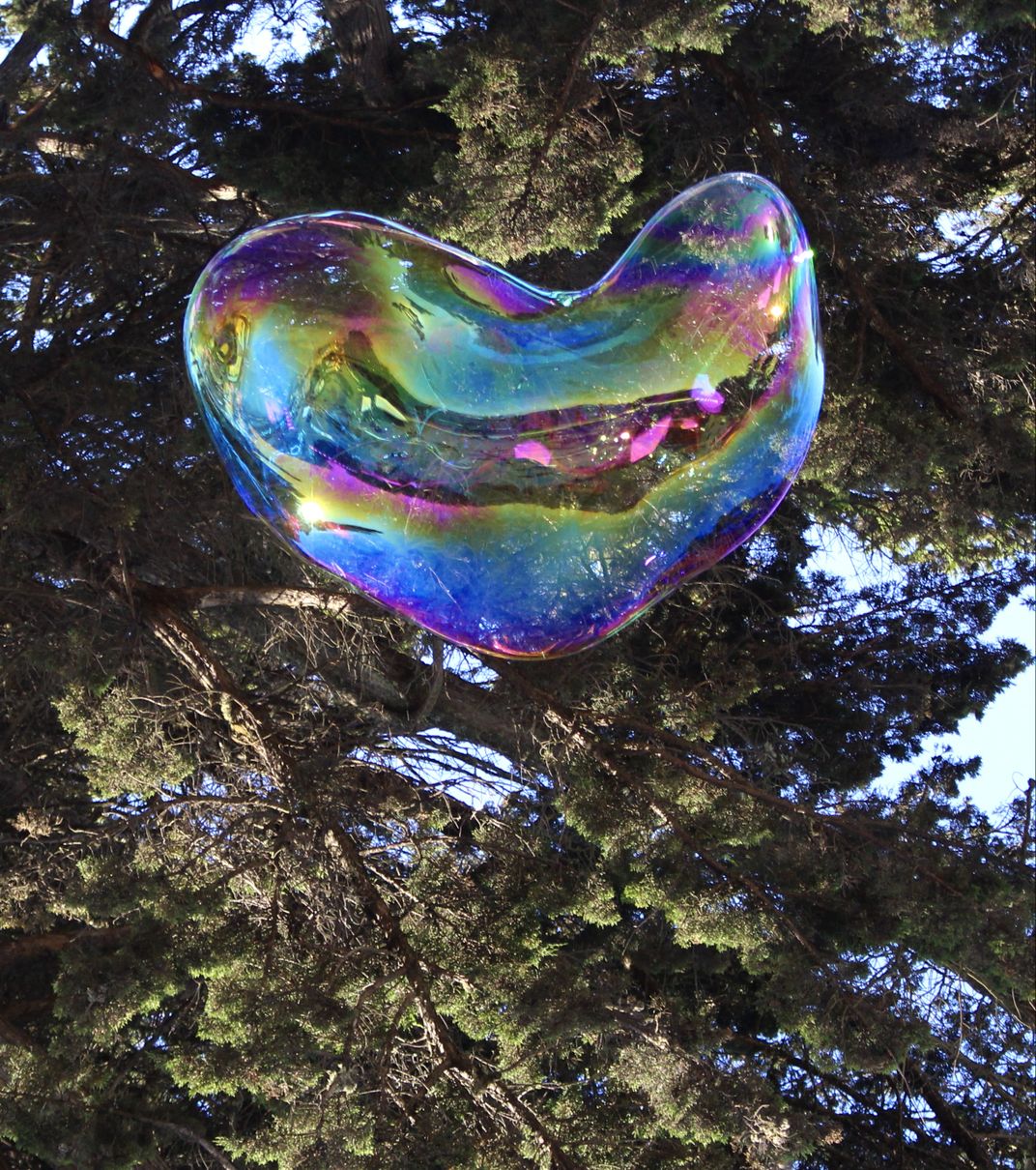 Soapy bubbles bring back childhood memories of a simpler life filled with promise. At a local street fair, this huge, bubble floating toward the sky was iridescent and eloquent. Its unique shape continued to evolve as it slowly ascended toward the sky. After having survived the Covid19 Pandemic over the past year, this colorful bubble represented the love, hope and gratitude we need to thrive.