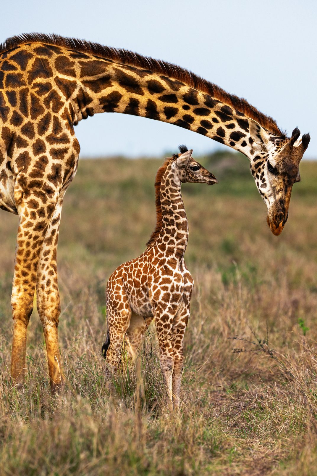 Intimate interaction between a baby giraffe and its mother.