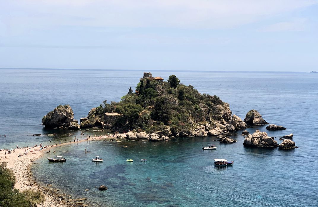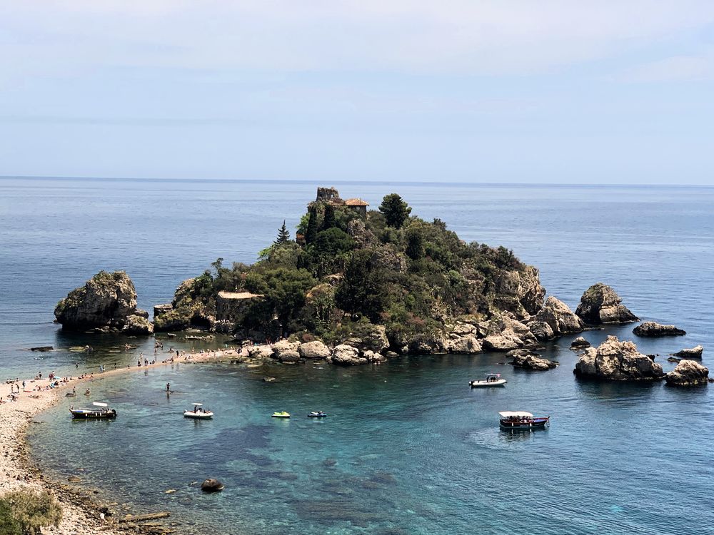 The view overlooks Isola Bella, where the narrow strip of sand, turquoise water, and rocky shoreline meet in a peaceful Sicilian cove. Boats drift around the island as visitors explore one of the Mediterranean’s most iconic seaside spots.