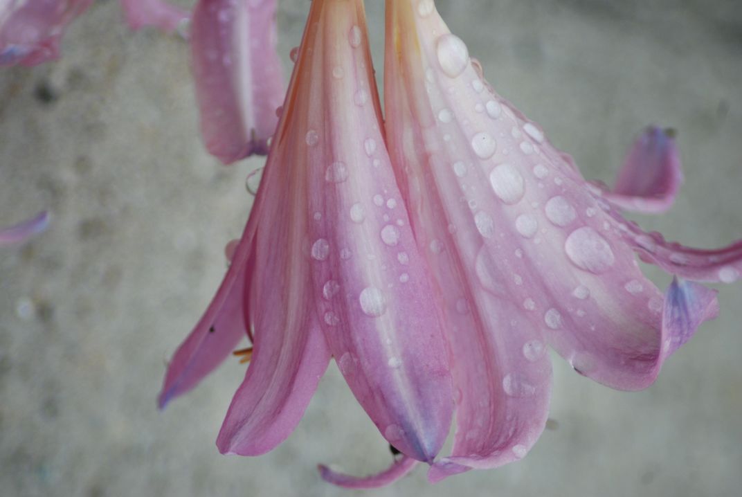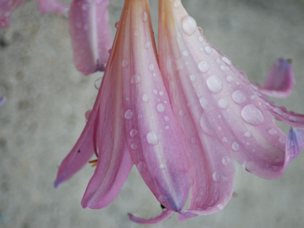 I don't know the name of this particular bloom. It's rather unicorn colored and so interesting to look at. It's a tiny blossom, really, though large enough to hang on to many raindrops.