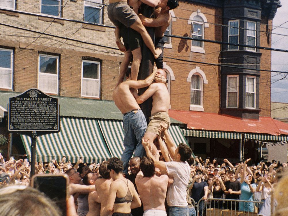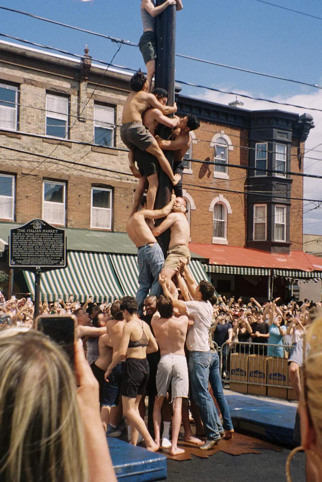 This is a photograph of the Italian Market Festival in Philadelphia. This event is the grease pole climbing competition, where participants attempt to get to the top to win meats and cheese’s. The entire community gathers to watch and celebrate the Italian Market’s history.