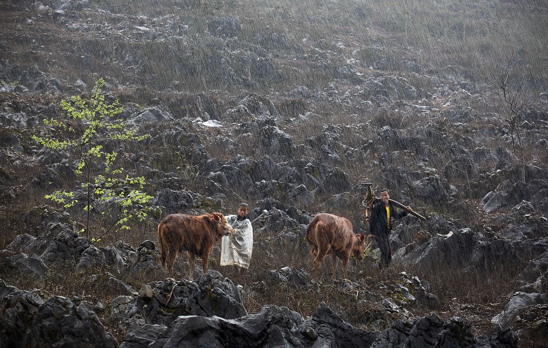 A farmer and his child are on their way home in the heavy rain, but perhaps because the rain is too strong, the little calf refuses to walk any further