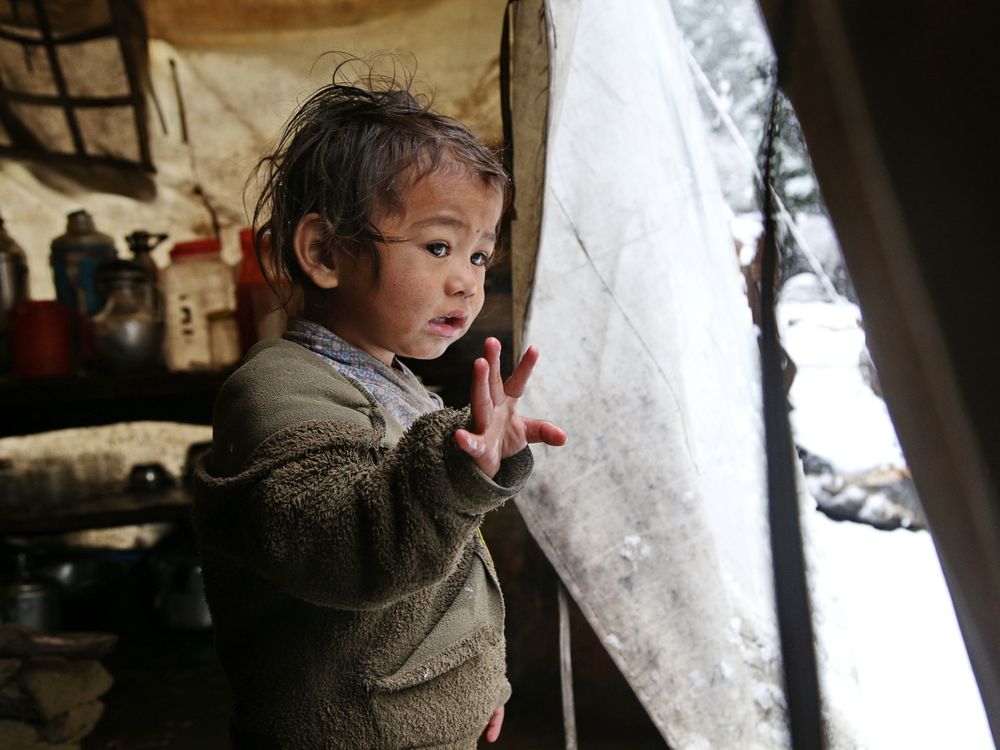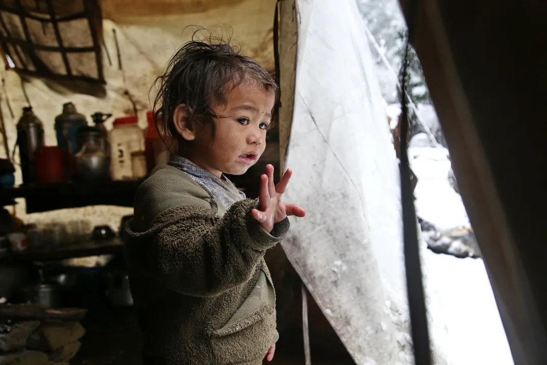 Nepali boy plays with snow outside a bhatti tent in Dolpo, Nepal
