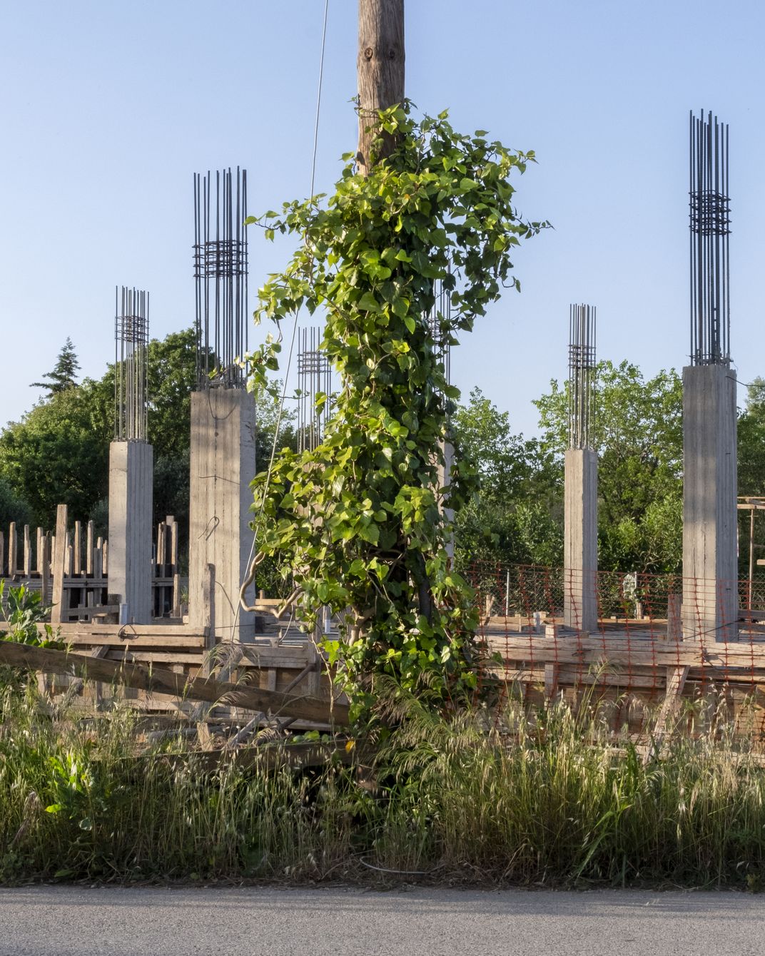 This is an image of a climbing plant called Ivy, here it has climbed an electricity pole which is in front of a construction site. This image is a time capsule containing the beauty of this Ivy that once stood at this site. The concrete columns behind give us a glimpse of the inevitable future. It's going to die.