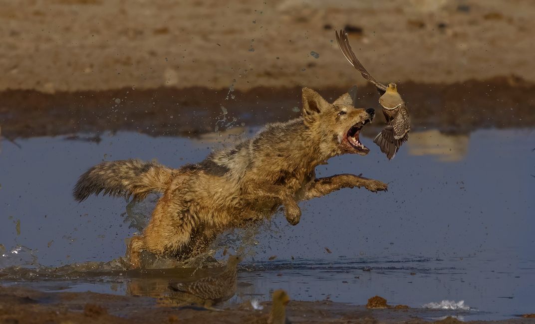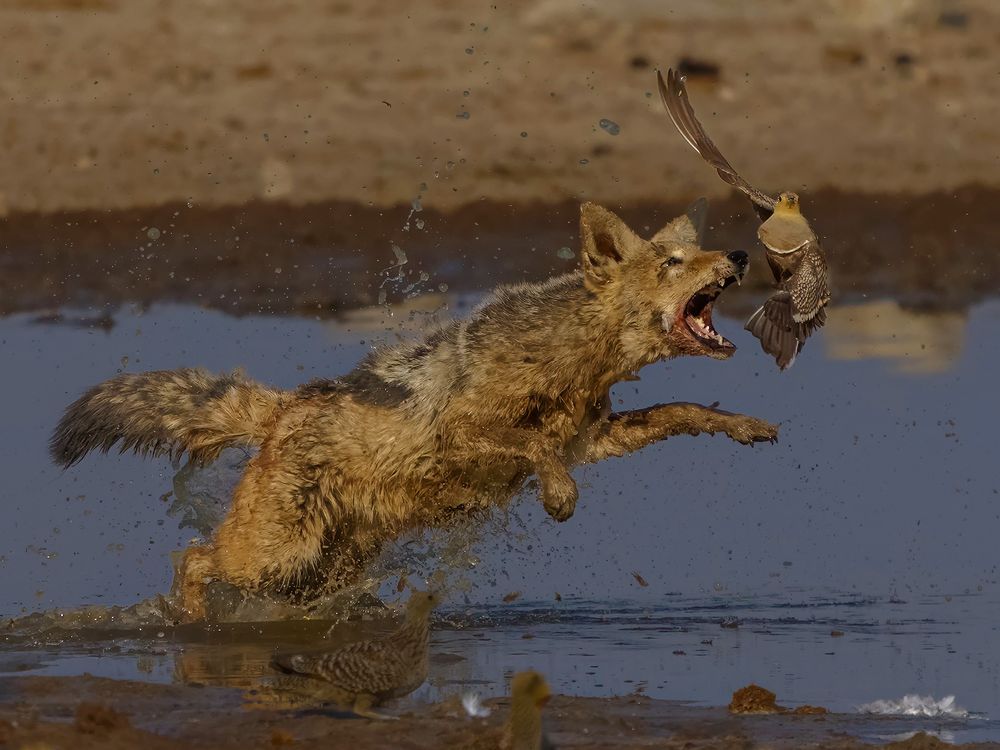 While we were parked next to a waterhole in the Etosha National Park, we saw a black-backed jackal hunting some bird that came to drink water at the waterhole. During the dry season large numbers of doves and sandgrouse come to drink water at this waterhole early mornings, as there is no other water sources nearby. The jackal kept walking around the waterhole waiting for the right moment to strike, When a large flock of birds arrive there is usually a lot of chaos amongst the birds trying to get to the water in the smallish water hole. Utilising the chaos, the jackal will jump and try to catch a bird – like in this image where he just missed out on a Namaqua sandgrouse. Such detail during the action can only be viewed via a still photo and not with the naked eye.