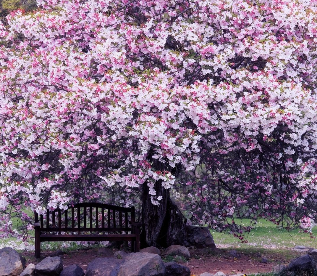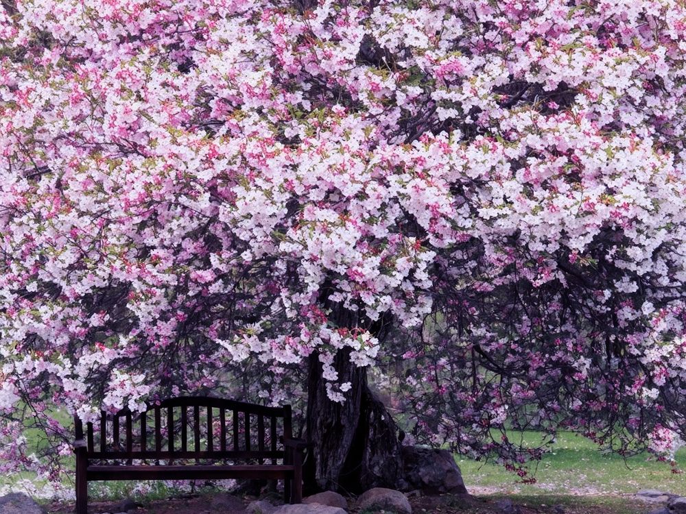 This photo shows the beauty of the Japanese cherry blossom tree. With a bench next to the tree with green garden.