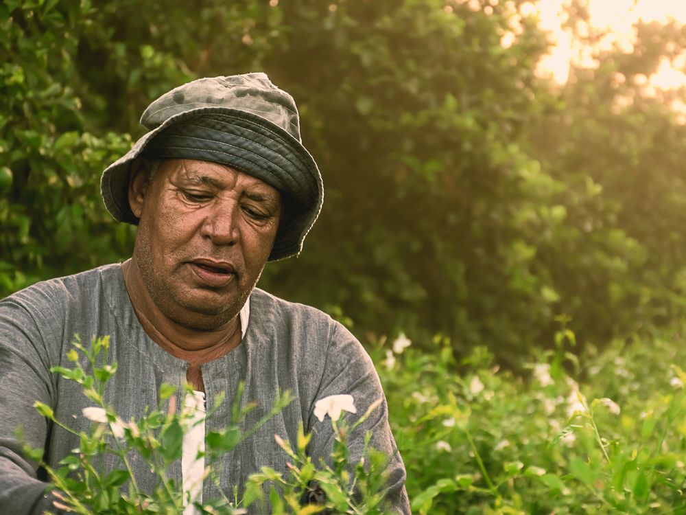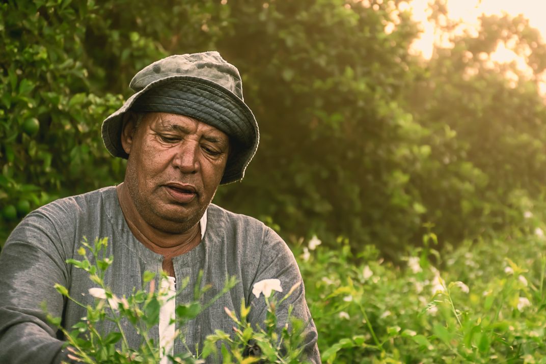 A picture of an Egyptian farmer in the early morning working on his farm, harvesting jasmine flowers, surrounded by the greenery of the crops.