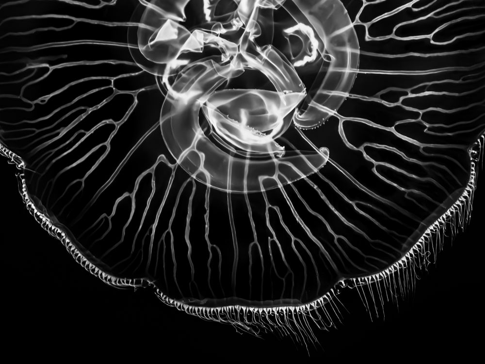 A macro close-up of a jellyfish resting against the glass of the Australian National Zoo Aquarium. The black and white highlights the details of the tentacles, veins and membranes against the watery background.