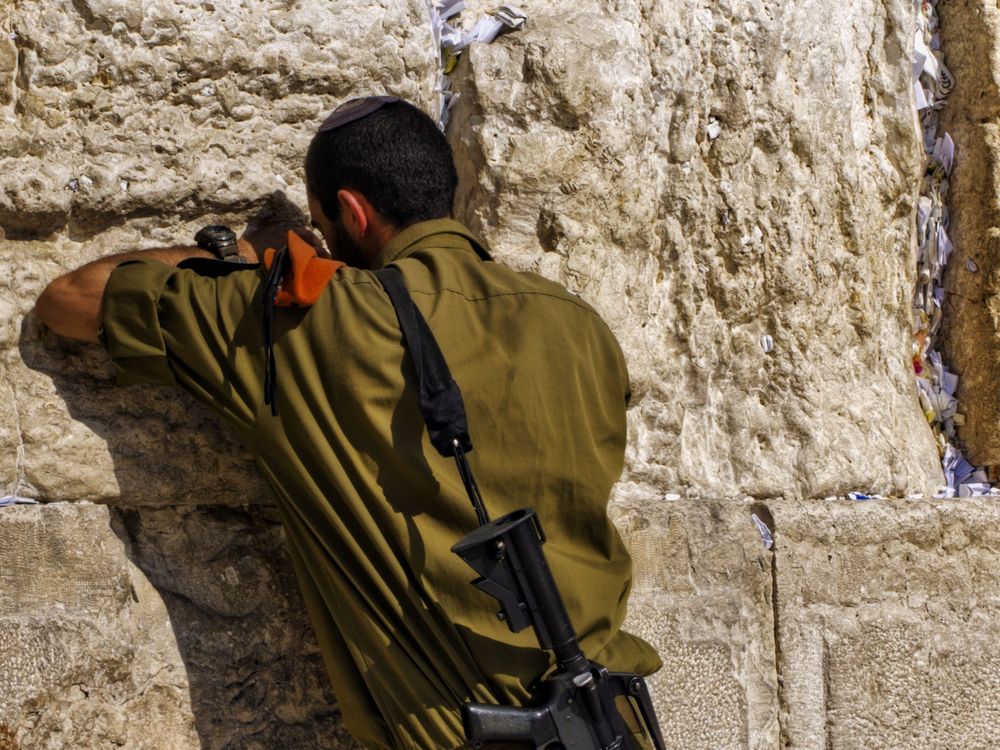 Jewish, Israeli soldier praying at the Western Wall with weapon; prayer notes visible.