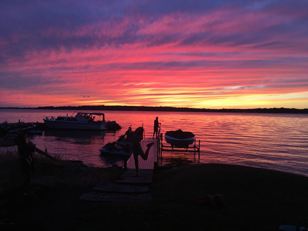 The sky was very vivid during the July 4th weekend. We could not believe it. I took the photo with my iphone. There are no alterations to the image. My 11 year daughter is posing in front and my brother in law on the dock.