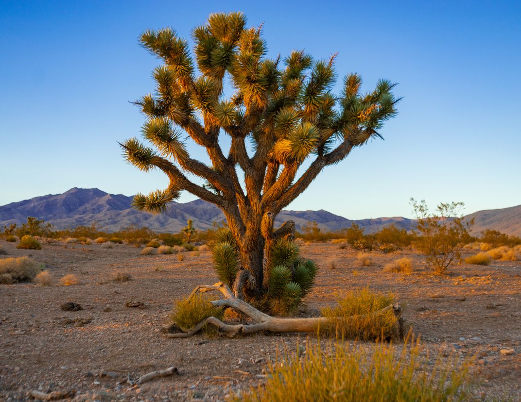 A Joshua Tree stands tall and proud during golden hour amongst a desert landscape that transitions into towering mountains in the distance.