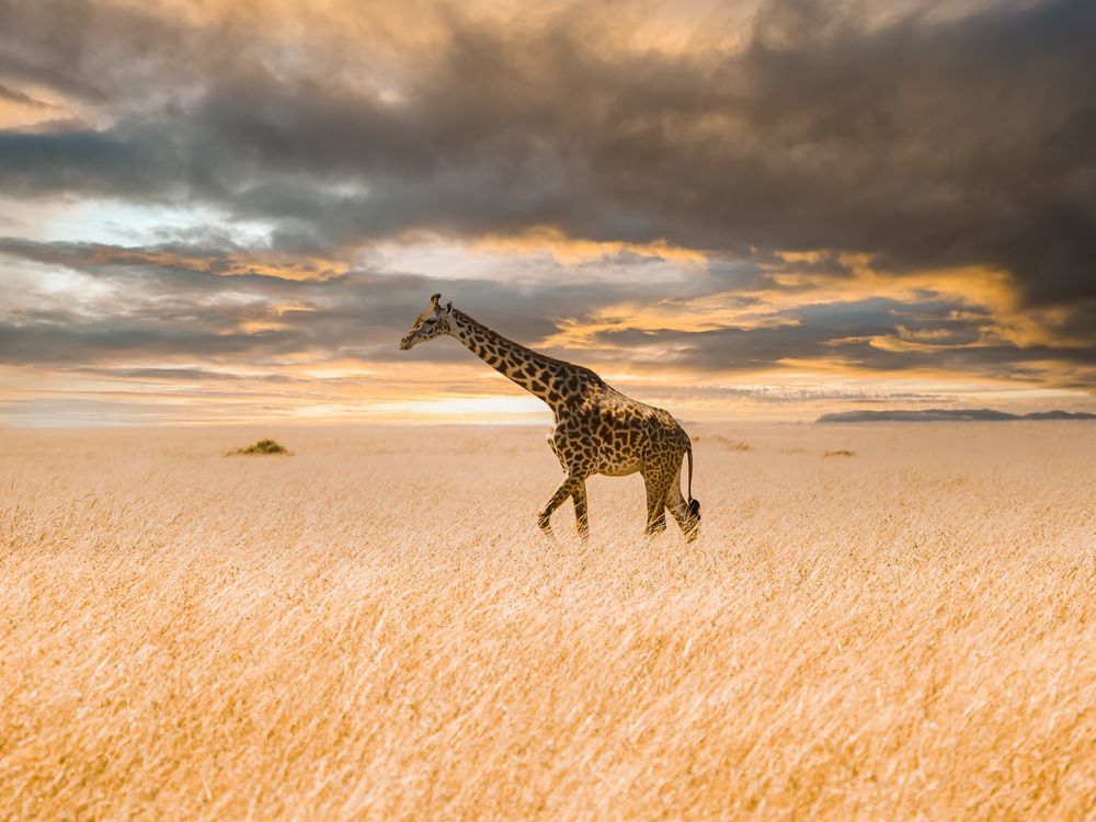 A lone giraffe walks gracefully across the endless savanna, framed by dramatic clouds and the warm glow of sunset, symbolizing freedom and timeless beauty of the wild.