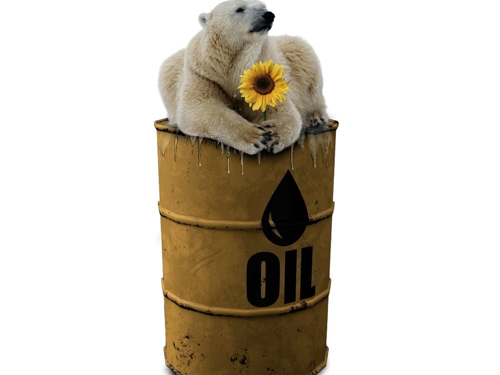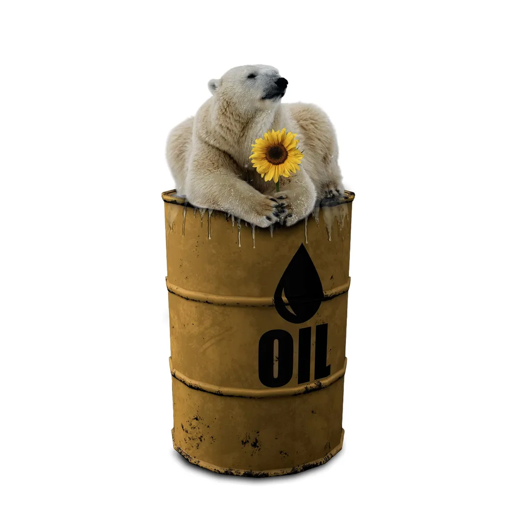 The Polar Bear, Oil Drum are symbols of the challenges facing us with climate change. The sunflower is a symbol of hope.