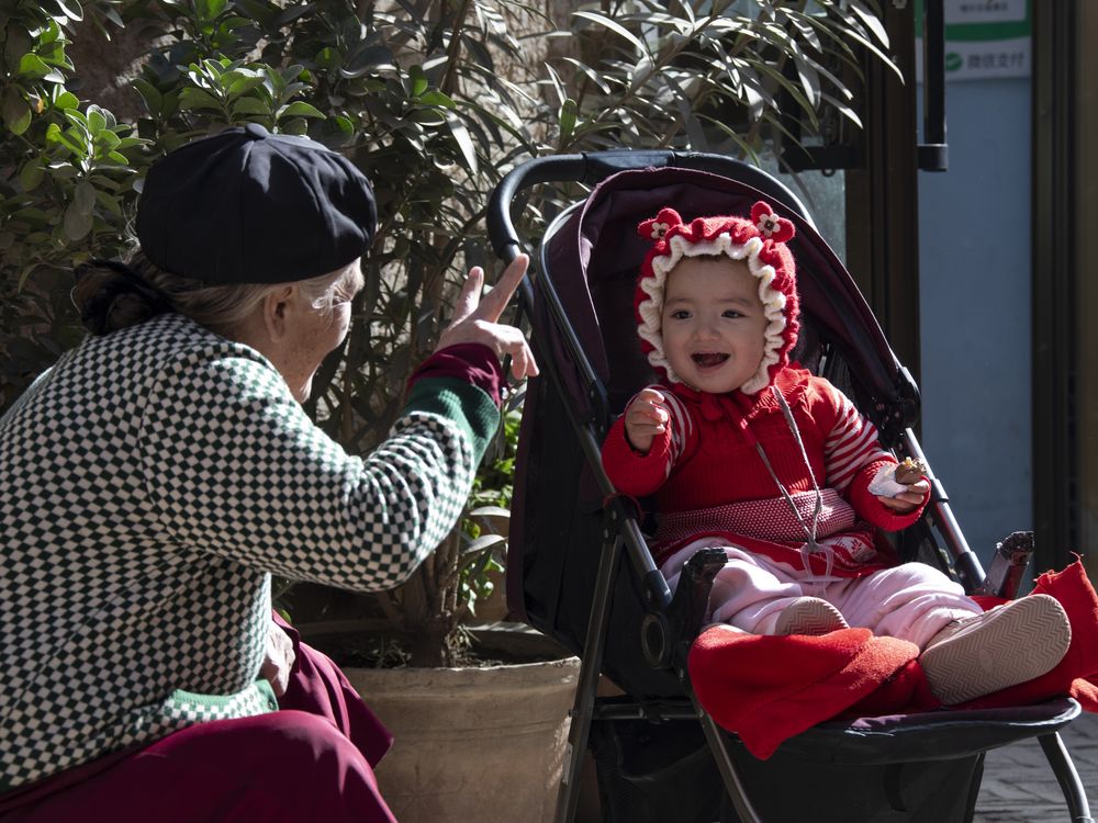 In the sunlight, an elder interacts with a child in a stroller. The gentle guidance of the elder’s fingertip carries warmth and affection, while the child’s wide, innocent smile radiates pure joy. The red and white clothing stands out vividly against the greenery and urban backdrop. Through these everyday details, the scene conveys a tender, natural intimacy and the simple vibrancy of daily life across generations.