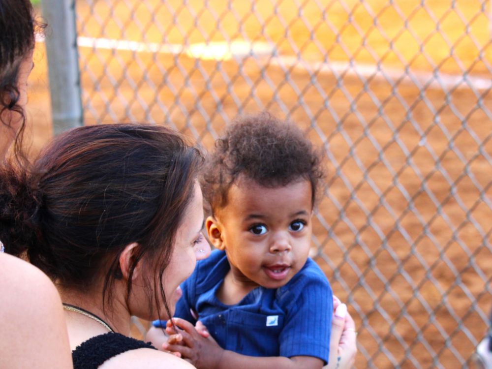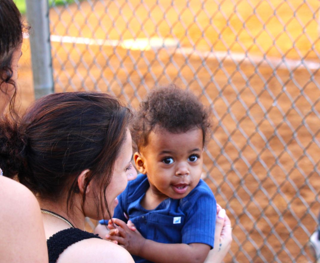 In loving arms by the ballfield fence, the little one glances up with bright curiosity, instantly becoming the star of the moment. A simple sunset game turns into a sweet memory of wonder, warmth, and summertime joy.