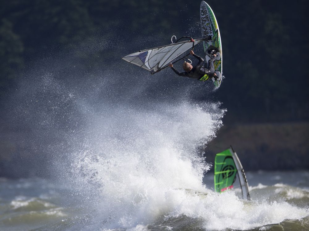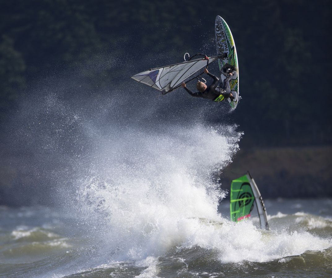 Windsurfing in the Columbia River Gorge is known for its Wind and the Heights one can get up in the Air. As the wind blows in one direction while the current moves down in the opposite direction, creating BIG waves, to jump off on.