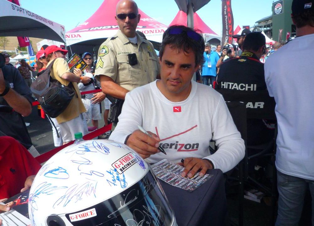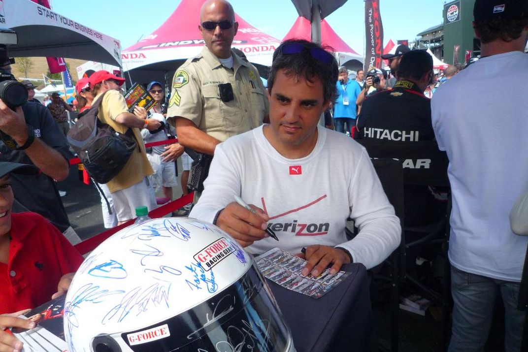 Juan Pablo Montoya did like to sign helmets but at the sit down signing in Sonoma Ca he was almost forced to sign in front of his fellow Indy drivers who all signed he did not want to look like a jerk the pic captures the moment as law enforcement looks on with interests this pic is priceless if you know the story