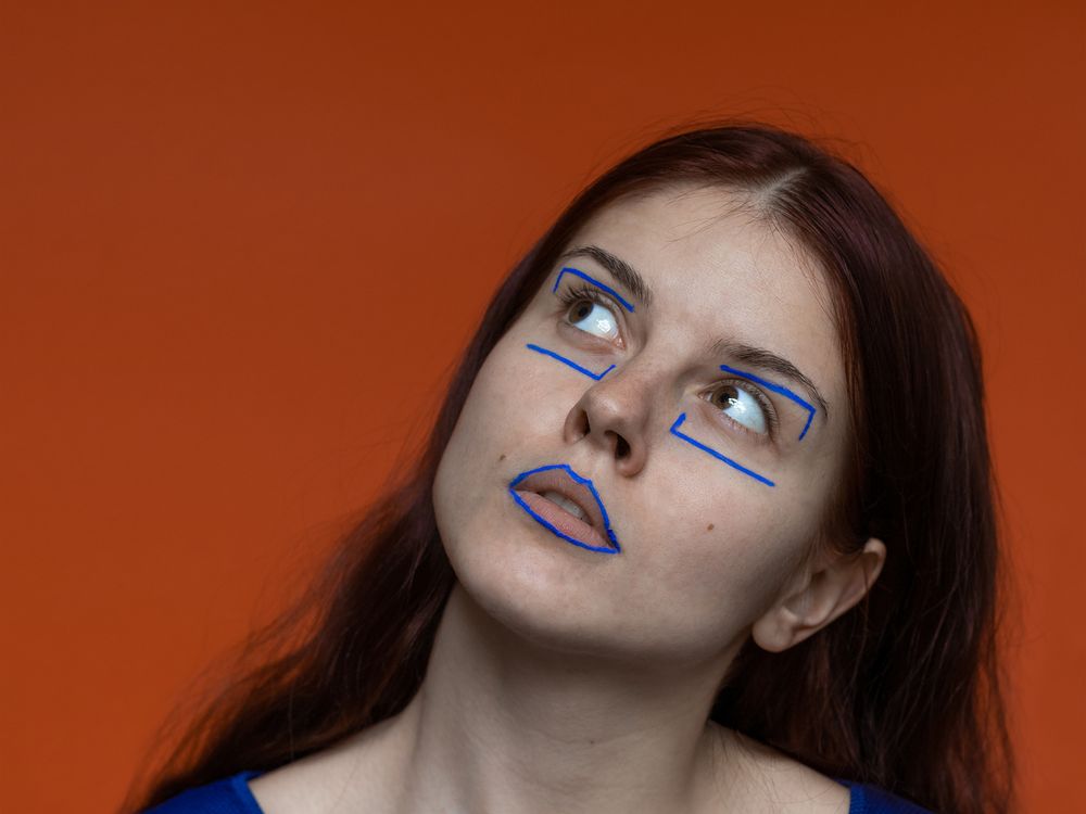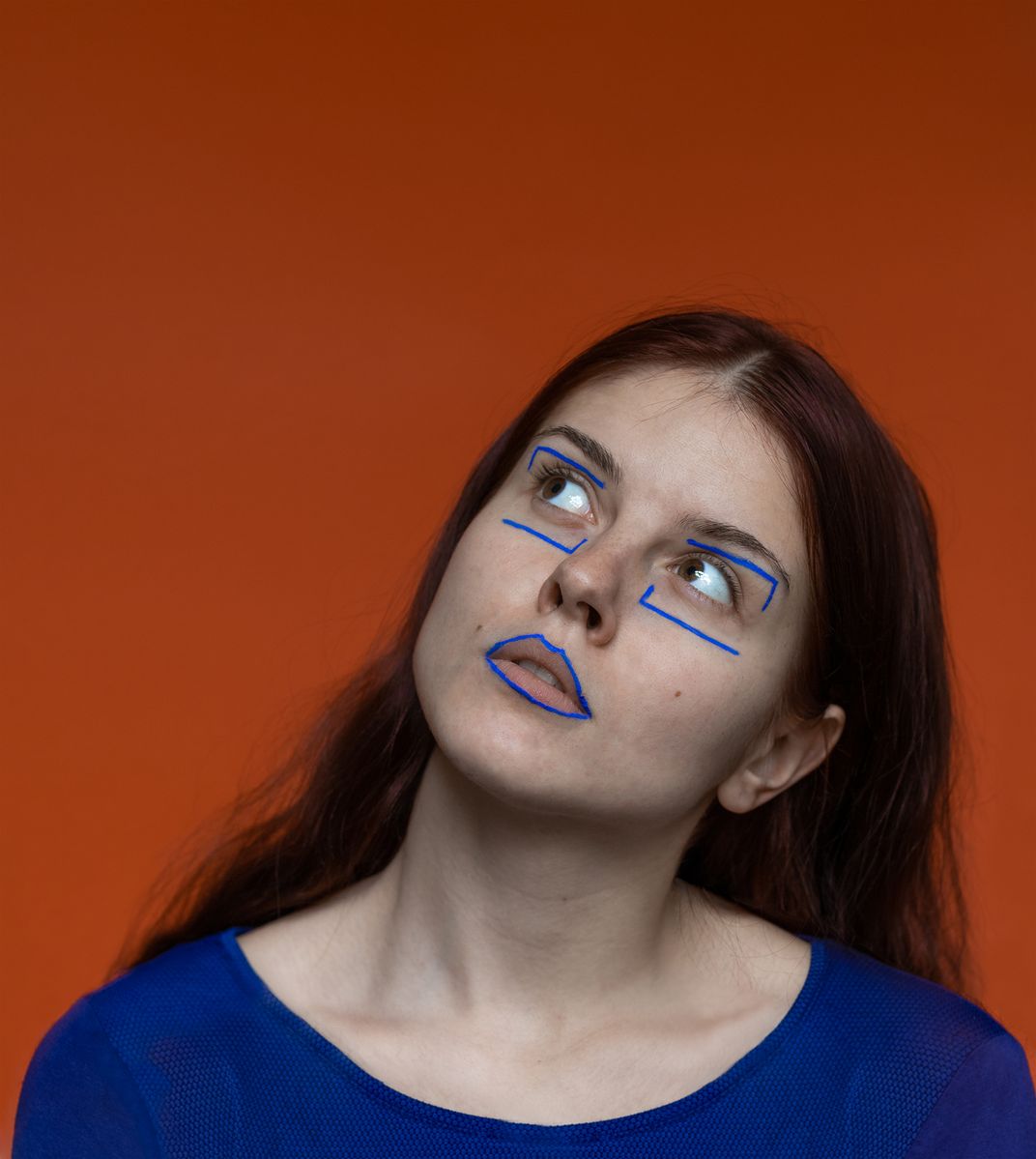 Whole series presents my friends with whom we wanted to feel the modeling and professional photography vibe This is the third photo in a series of graphic-makeup portraits. In the photograph you can see my good friend Jula. I wanted to capture her sharp facial features by using color contrast and rectangular lines.