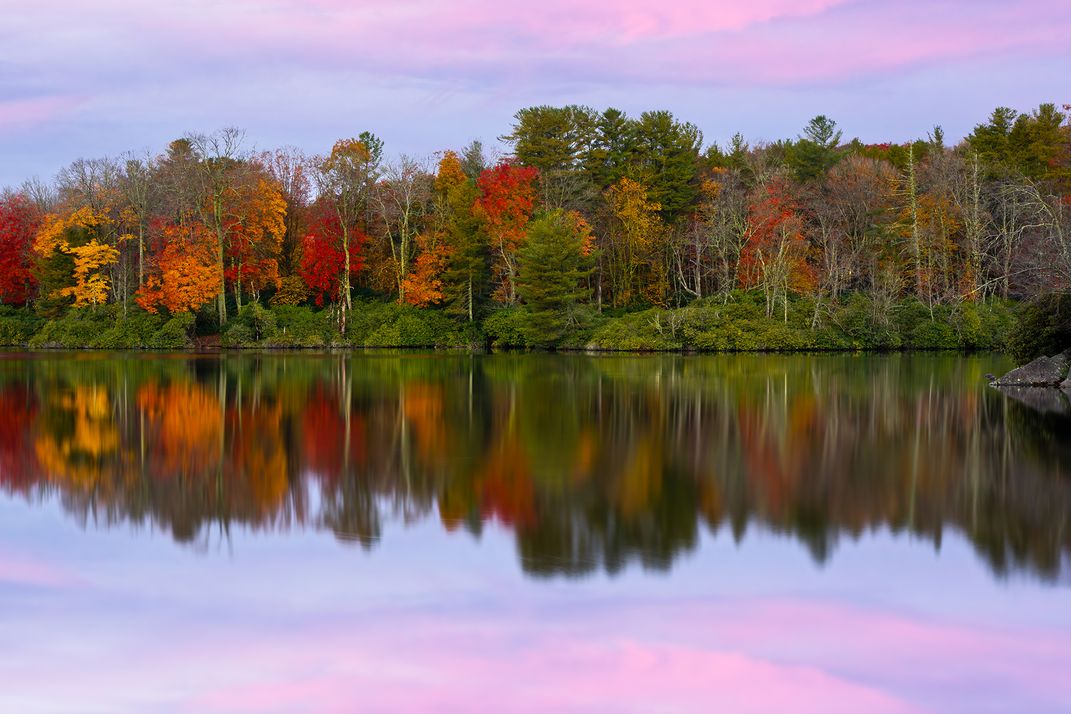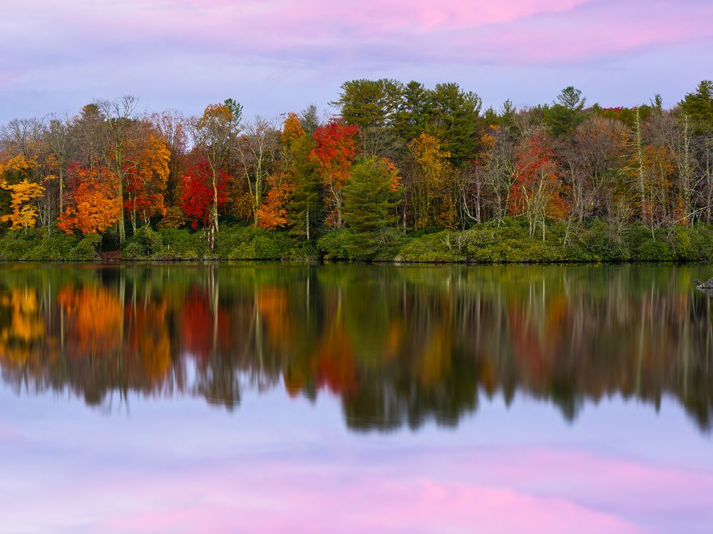 This is a photo of Julian Price Lake in the fall just before sunrise on the Blue Ridge Parkway on North Carolina.