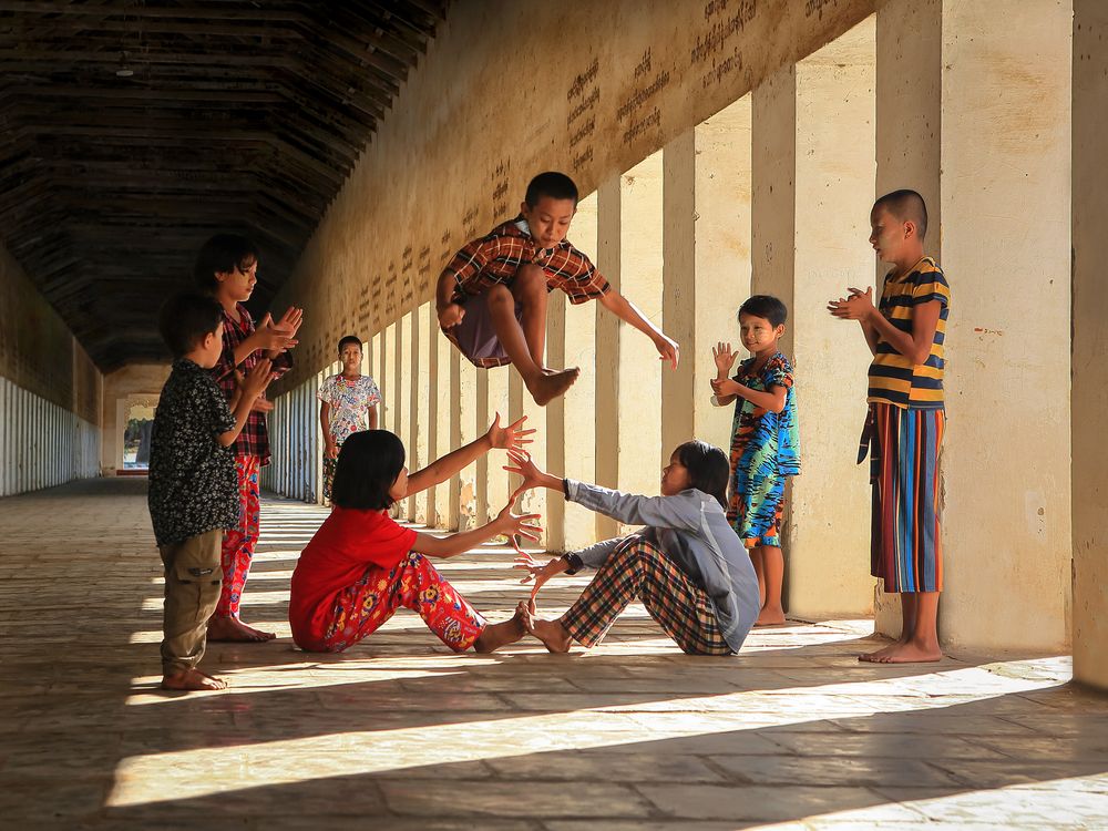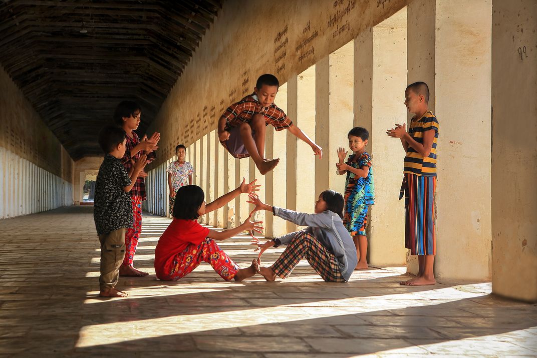 Children enjoying their weekend playing jumping game without any rope but using legs and hands.