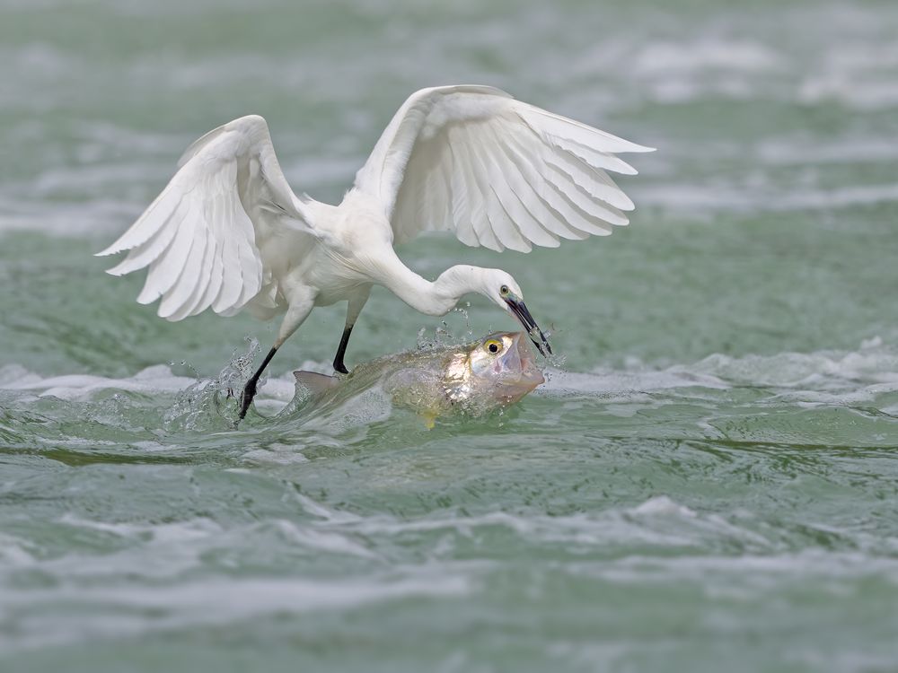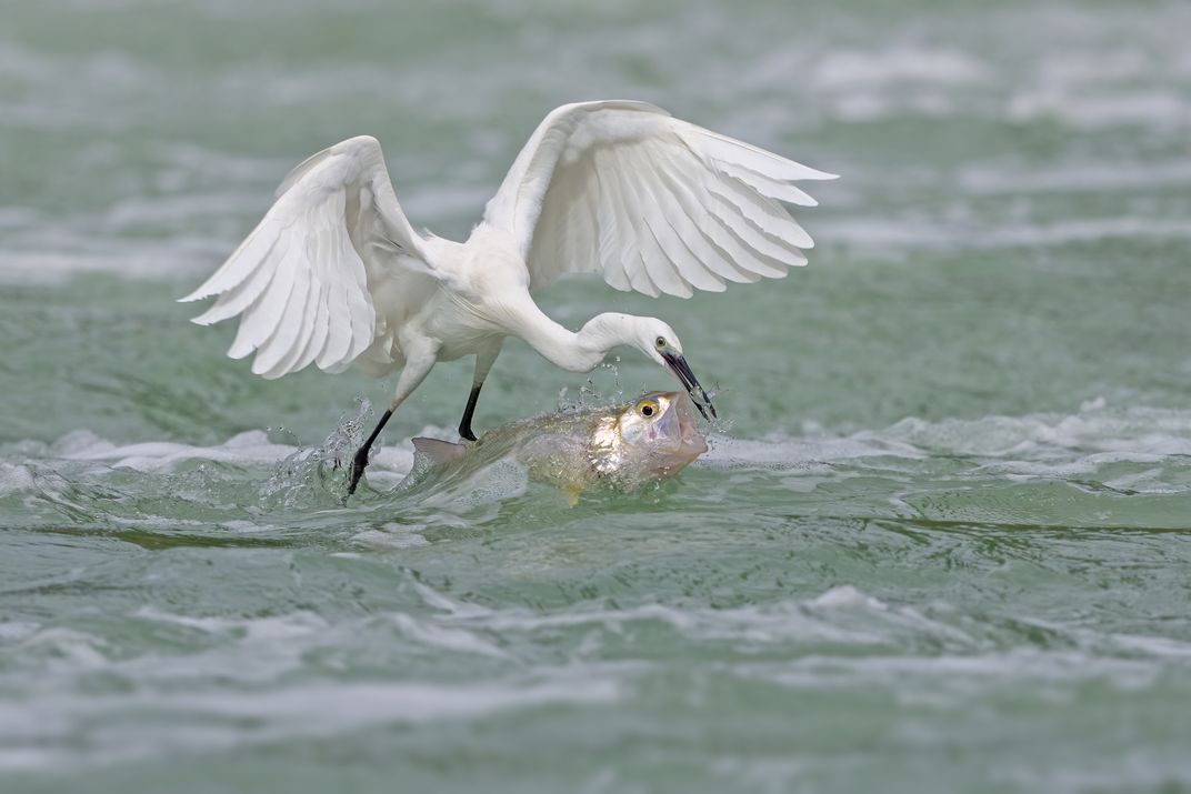 Xiamen Yundang Lake adheres to the sustainable development of the ecological environment, utilizing the tidal effect of seawater to divert seawater into the lake. This not only purifies the lake, but also provides abundant food for egrets, appearing a beautiful scenes of egrets and big fish competing for small fish. On the turbulent sea surface, as soon as the egret caught a small fish, the fierce big fish rushed out of the water, opened its big mouth, and prepared to snatch the small fish. Under the rule of the jungle where the weak prey, who would the small fish belong to?