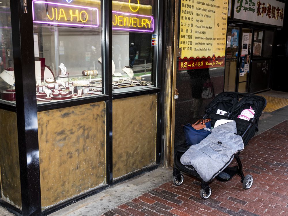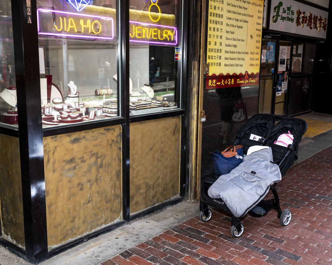 A stroller is left outside a local shop in Chinatown, Boston.