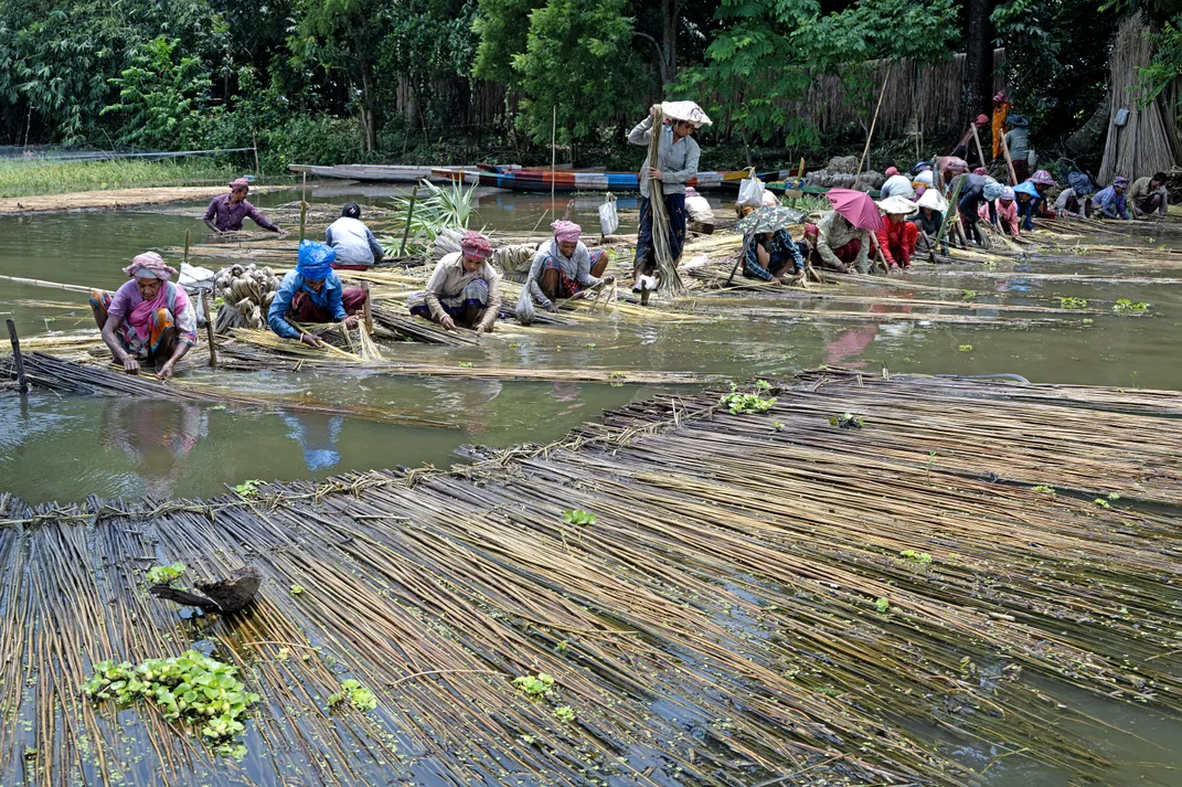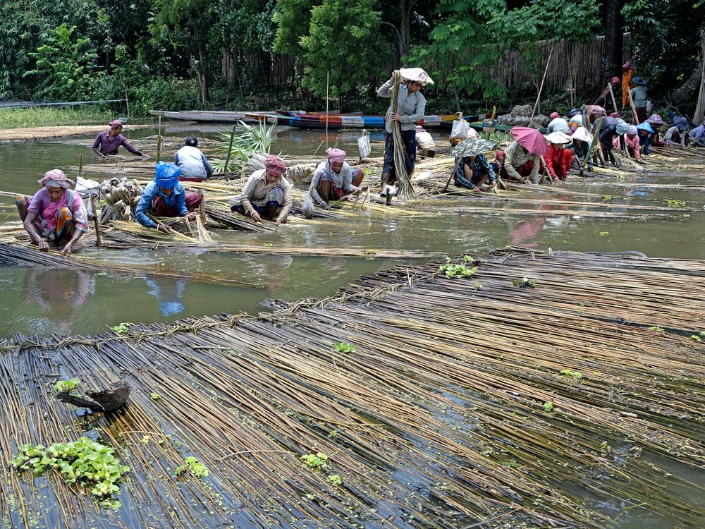 A group of rural workers is extracting jute fibers from rotten jute plants on a path surrounded by waterbodies.