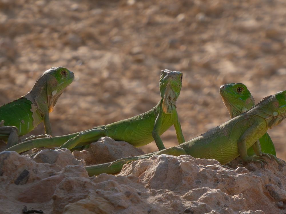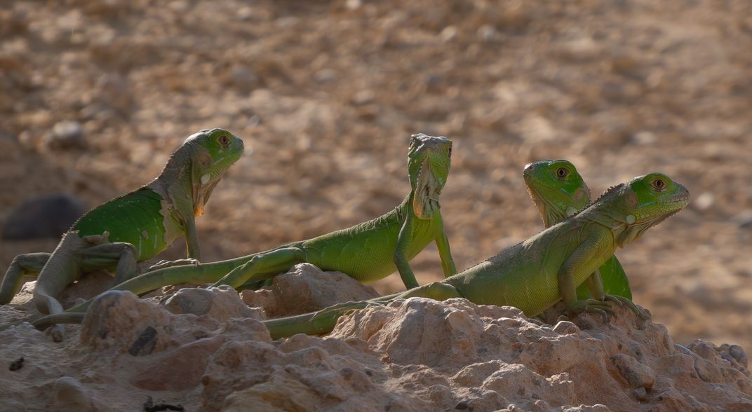 Lizards and rocks. As simple as that. Four lizards, chilling around on some rocks, one staring defiantly at the camera. Lizards are small and young, ready to explore the beauty of life.