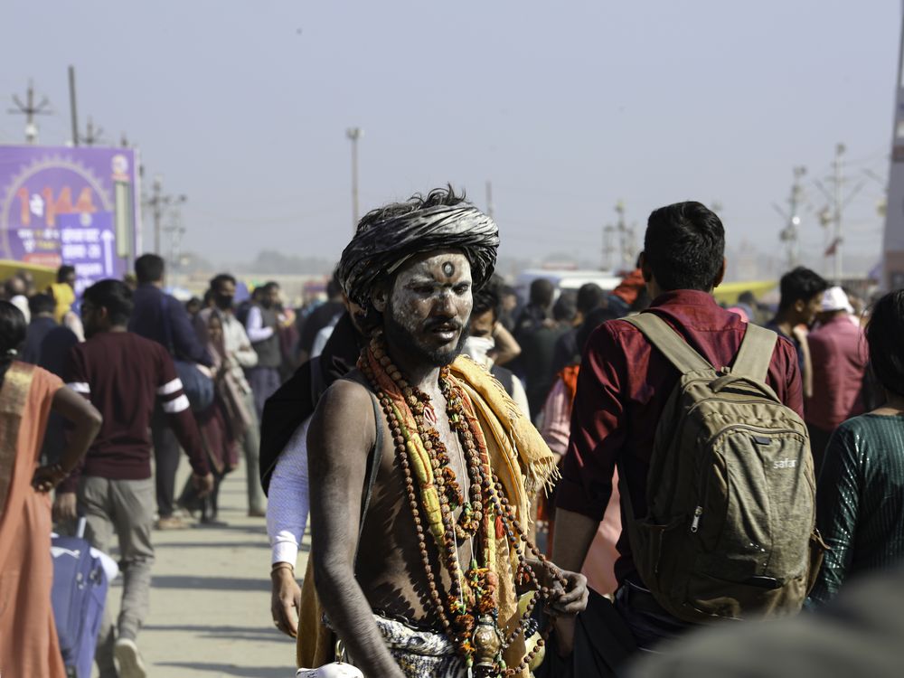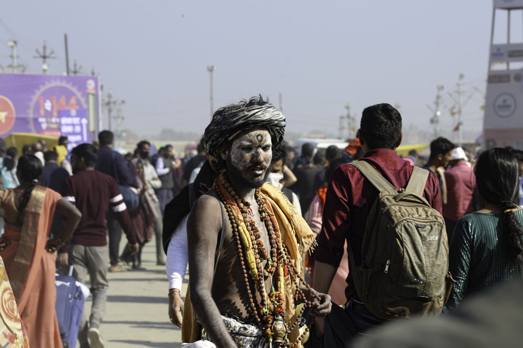 A wandering sadhu walks through the crowd, covered in holy ash and prayer beads. His presence bridges the ancient and the living — faith walking amidst the modern world.
