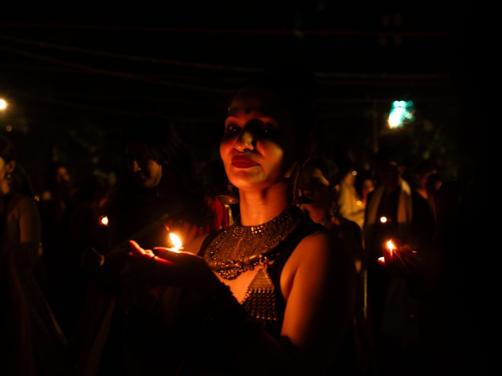 In the heart of Garba, she holds a diya, its flame trembling like centuries of tradition. Her gaze meets the camera, quiet yet piercing, carrying the weight of stories passed down through generations, a moment where the festival pauses to honor her presence.