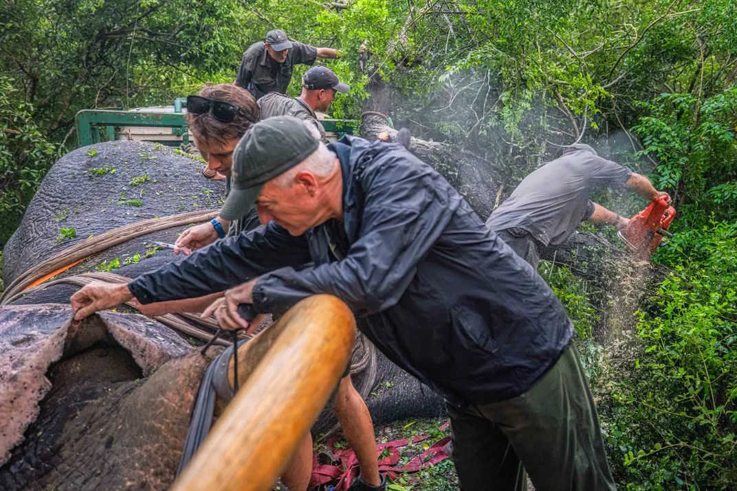 Kester Vickery waits and monitors the elephant while the team work tirelessly to cut a road to where the elephant fell. Taken during an elephant rescue and translocation in KwaZulu-Natal.