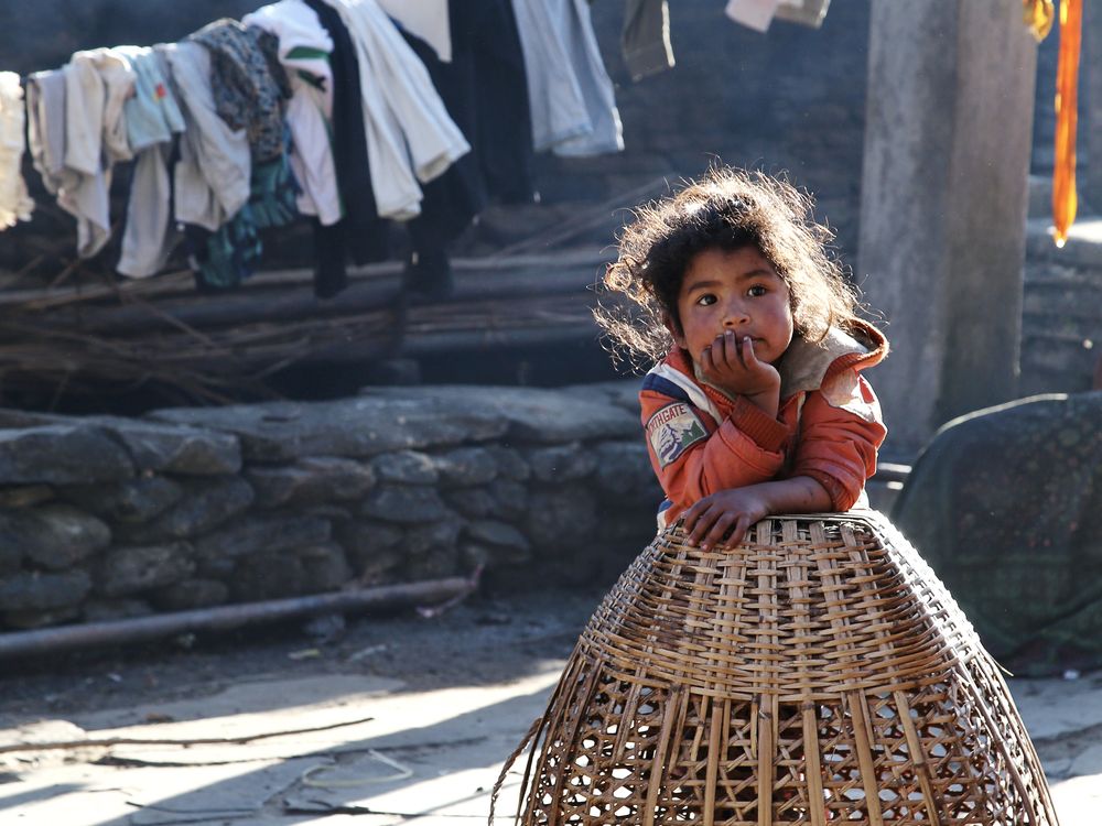 A local child plays in Gurja Khani village, Nepal. Gurja Khani is a predominantly Chhantyal village located in a secluded valley at the foot of Gurja Himal range, separated by mountain passes from the rest of the world, and only accessible on foot. Its isolation has allowed it to preserve total authenticity. While electricity and mobile connection are already available in Gurja Khani, not a single ancient house has so far been replaced with a modern structure.