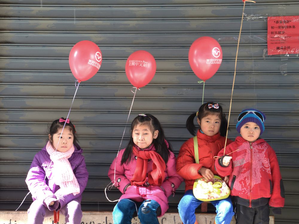 This image is about kids that were sitting randomly in front of a closed store. Each one was holding a red ballon. It was a New York new year festival, and the kids with their caretaker I guess they were resting because they were outside the parade.