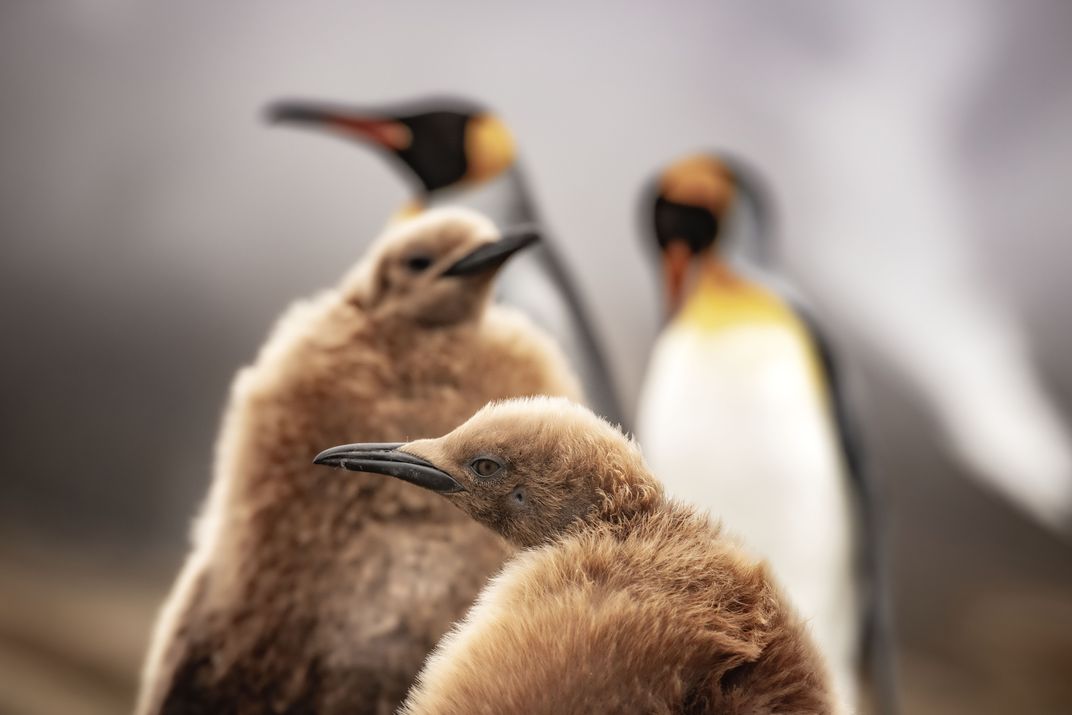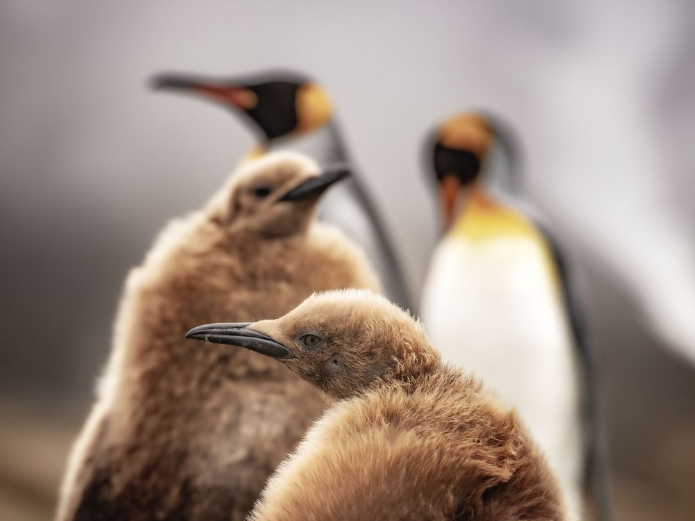 2 King Penguin chicks with 2 adults in the background in Fortuna Bay on South Georgia Island.