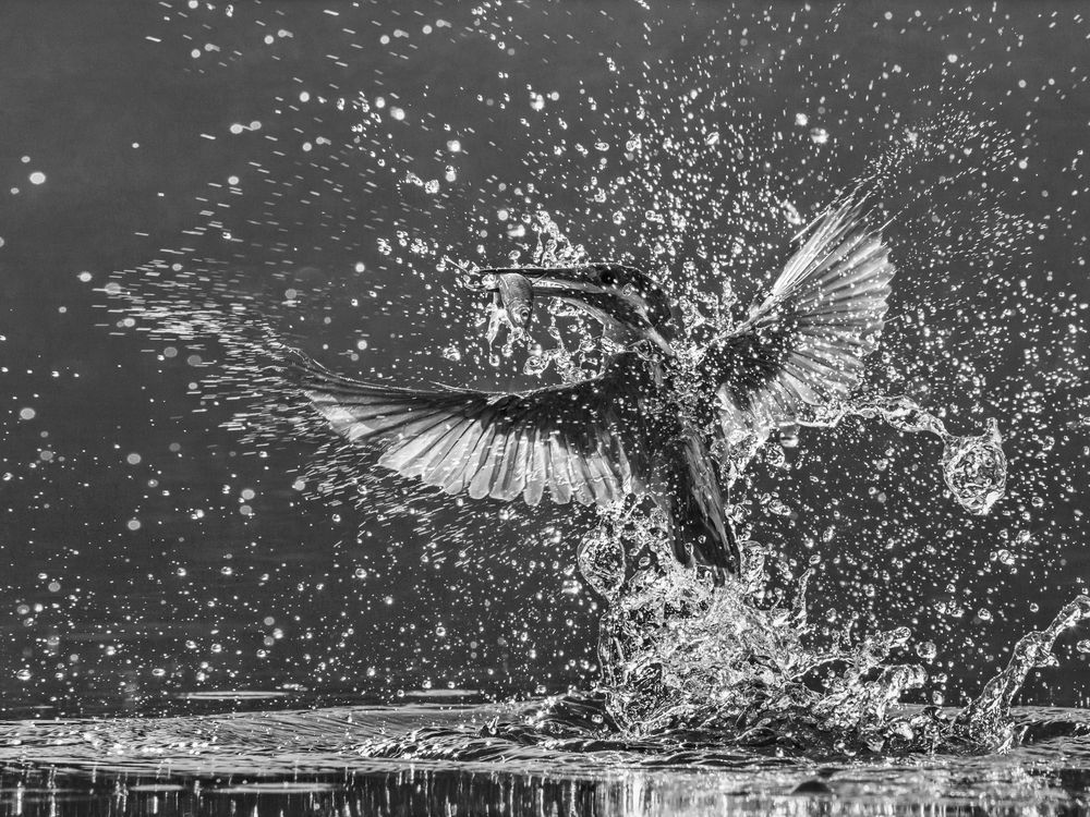 The work was shot in Guangdong, China, recording the scene of kingfishers leaping out of the water at the moment of hunting.
