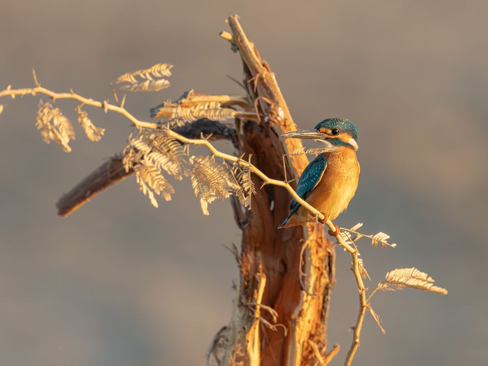 A Blythe's Kingfisher perches on a branch in Mithaghoda, India, its honey-colored breast feathers enhanced by the golden light of the setting sun. These birds are large (for kingfishers), usually around nine inches long. They live near streams and small waterways throughout South and Southeast Asia, diving into the water to catch fish and insects.
